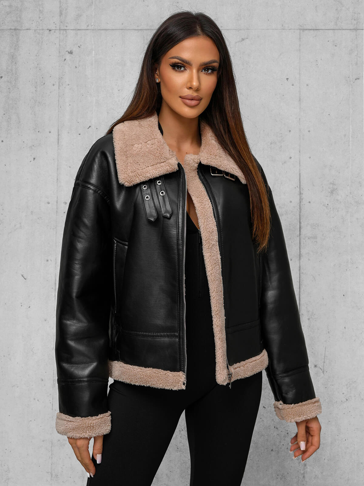 Sieviešu ādas jaka melni-smilšu OZONEE JS/11Z8176Z
